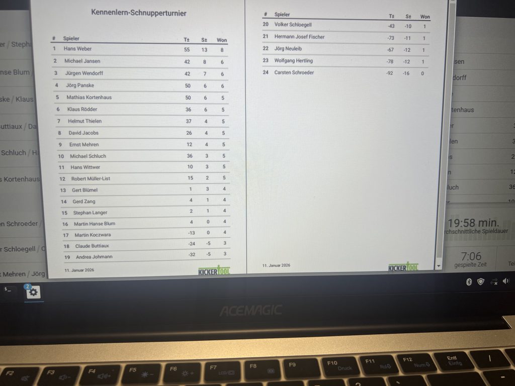 Trotz des winterlich schlechten Wetters fanden sich 24 motivierte und erwartungsvolle Spielerinnen und Spieler in der Halle ein. Bereits um 8 Uhr morgens wurde die Halle aufgeschlossen, aufgebaut und vorbereitet – die Vorfreude war von Beginn an spürbar. Ab 12 Uhr ging es dann sportlich zur Sache, als in mehreren Runden um die Plätze gekämpft wurde.