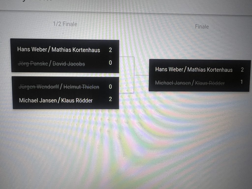 Nach acht zufällig ausgelosten Doppelrunden standen schließlich die Halbfinalpartien fest. Im ersten Halbfinale trafen Weber / Kortenhaus auf Panske / Jacobs. Das zweite Halbfinale bestritten Wendorf / Thelen gegen Jansen / Rödder. Hier entwickelte sich ein besonders spannendes Match, das bis in den Entscheidungssatz ging. Dort behielten Jansen und Rödder klar die Oberhand, spielten ihren Stiefel souverän herunter und sicherten sich verdient den Finaleinzug.