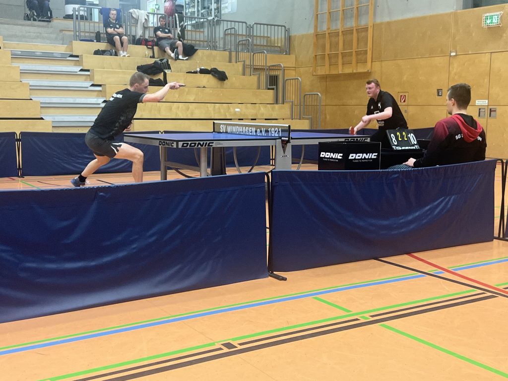 Auf Platte eins traten Louis Mesenholl und Colin Grave gegen Jonas Sonntag und Marcel Hippchen an. In einem spannenden Fünfsatzspiel lieferten sich beide Duos sehenswerte Ballwechsel. Am Ende mussten sich die Windhagener Youngsters um Kapitän Louis und Abteilungsleiter Colin jedoch knapp geschlagen geben.